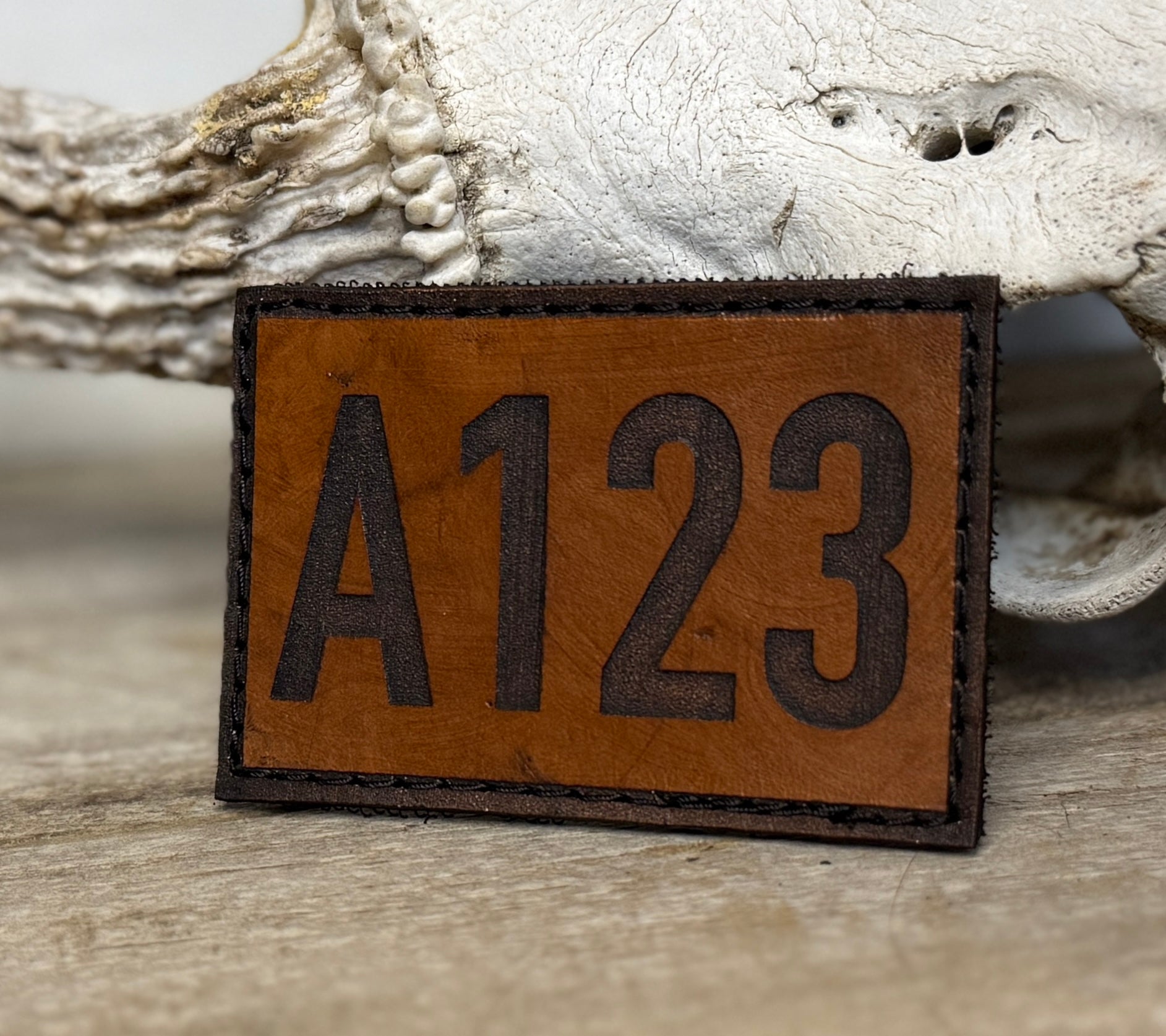 Custom callsign laser-engraved genuine cowhide leather Velcro-backed patch. Machine-stitched. Hand-dyed. Measures 3x2 inches. Custom available.