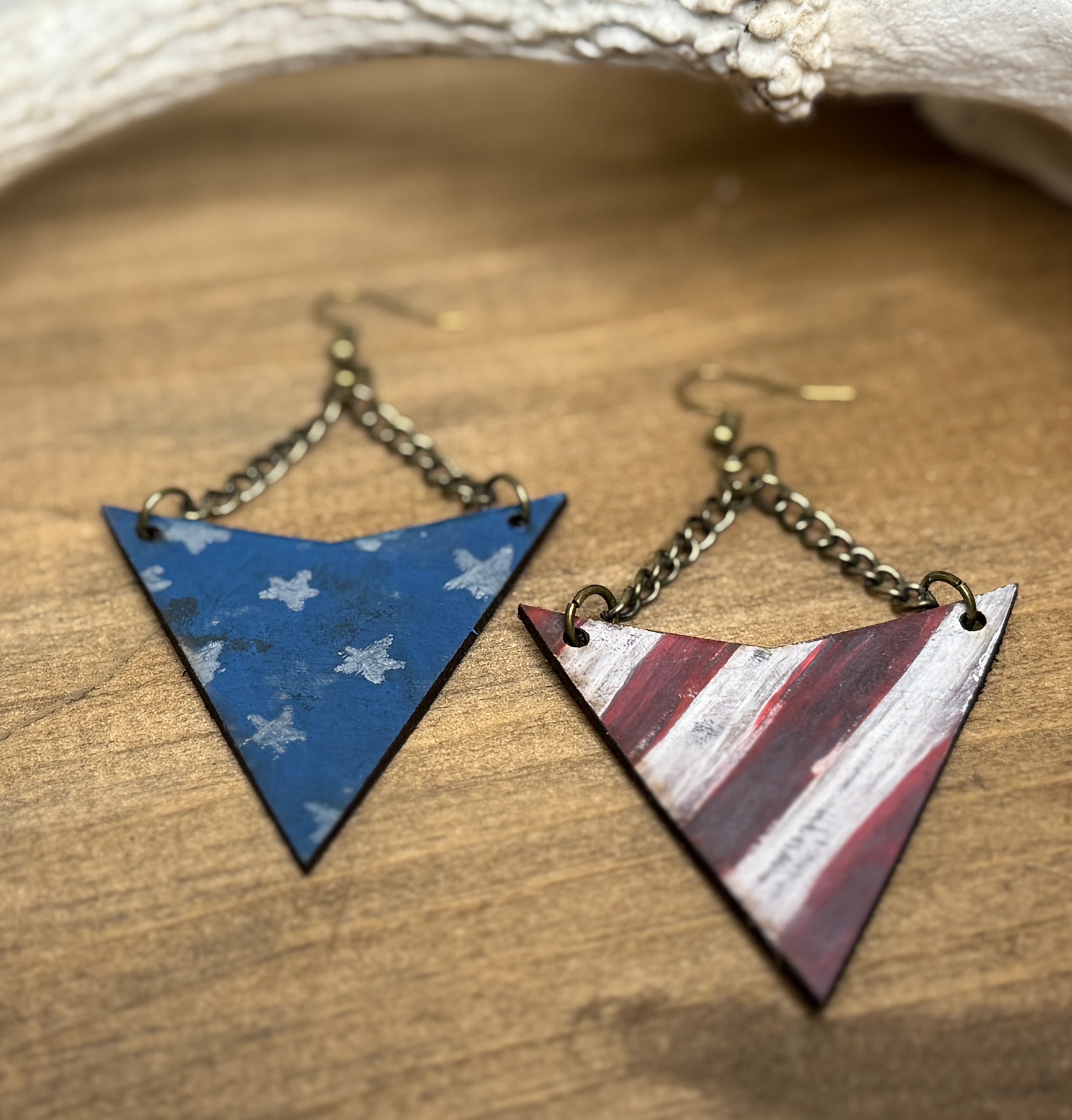 Hand-painted and distressed leather American flag earrings. 3” drop.