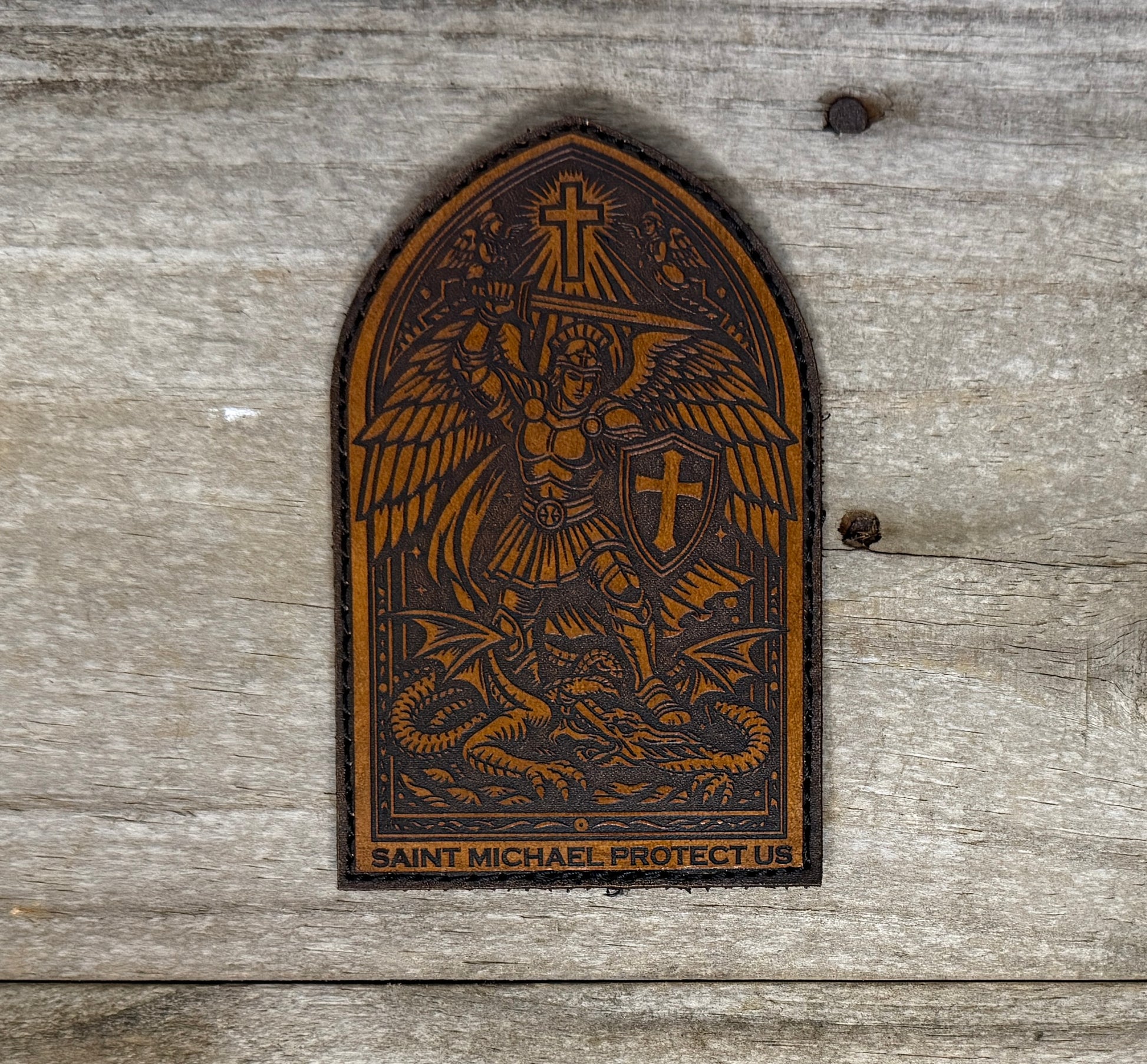 A powerful depiction of Saint Michael the Archangel, engraved into full-grain leather.
